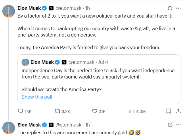 એલન મસ્કે તેમના સોશિયલ મીડિયા પ્લેટફોર્મ ‘X’ (અગાઉ ટ્વિટર) પર આ ઘોષણા કરી છે. તેમણે તાજેતરમાં હાથ ધરેલા એક સર્વેક્ષણના પરિણામોનો હવાલો આપતા જણાવ્યું કે, જનતાએ 2:1 ના ગુણોત્તરમાં એક નવા રાજકીય વિકલ્પની ઈચ્છા વ્યક્ત કરી છે. મસ્કે 4 જુલાઈના અમેરિકન સ્વતંત્રતા દિવસ નિમિત્તે તેમના ફોલોઅર્સને પૂછ્યું હતું કે “શું તમે બે-પક્ષીય (જેને કેટલાક લોકો એક-પક્ષીય કહે છે) સિસ્ટમમાંથી સ્વતંત્રતા ઈચ્છો છો! શું આપણે અમેરિકા પાર્ટી બનાવવી જોઈએ?”