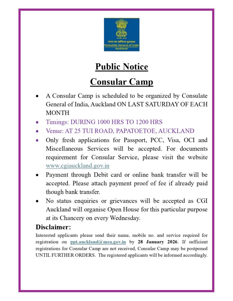 ઓકલેન્ડ: ઓકલેન્ડ સ્થિત ભારતીય હાઈ કમિશન (Consulate General of India) દ્વારા ભારતીય નાગરિકો અને પ્રવાસીઓની સુવિધામાં વધારો કરતા બે મહત્વની જાહેરાતો કરવામાં આવી છે. અત્યાર સુધી મહિનામાં એકવાર યોજાતું ‘ઓપન હાઉસ’ હવે દર અઠવાડિયે યોજવાનો નિર્ણય લેવામાં આવ્યો છે.