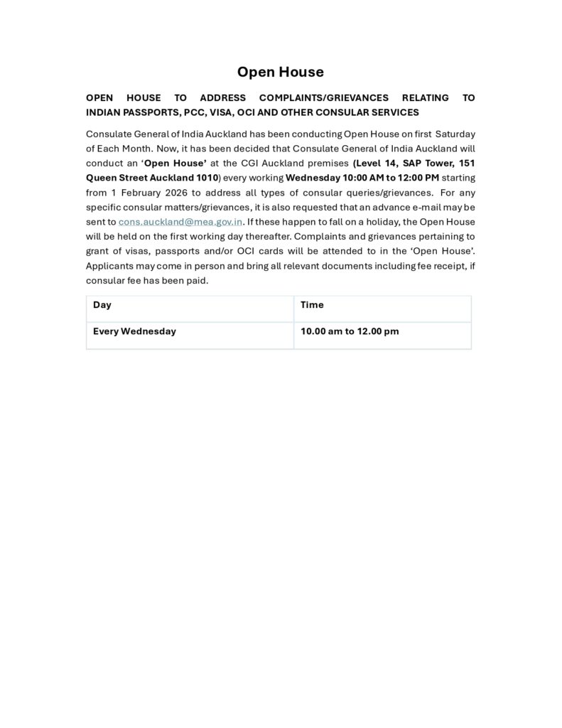 દર બુધવારે ‘ઓપન હાઉસ’નું આયોજન કોન્સ્યુલેટ દ્વારા લેવાયેલા નવા નિર્ણય મુજબ, 1 ફેબ્રુઆરી 2026 થી દર કામકાજના બુધવારે સવારે 10:00 થી 12:00 વાગ્યા દરમિયાન ‘ઓપન હાઉસ’ યોજાશે.